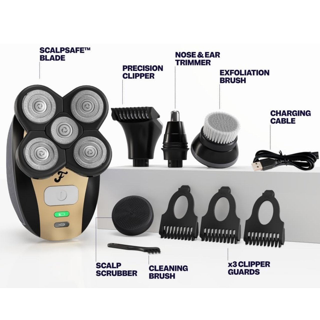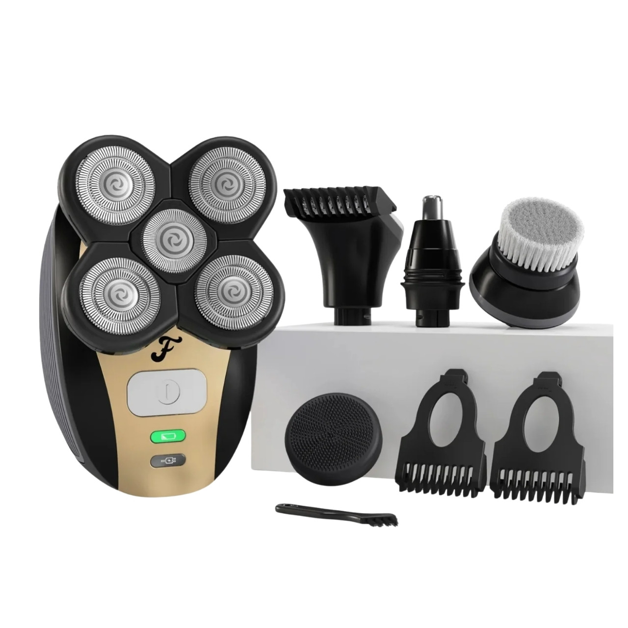 | U paketu: | 1x bežični brijač, 1x USB kabel za punjenje, 1x četkica za čišćenje, 1x rotacijska oštrica, 3x nastavak za šišanje (3mm, 5mm, 7mm), 1x nastavak za dlake u nosu/ušima, 1x četka za piling, 1x masažer za vlasište |